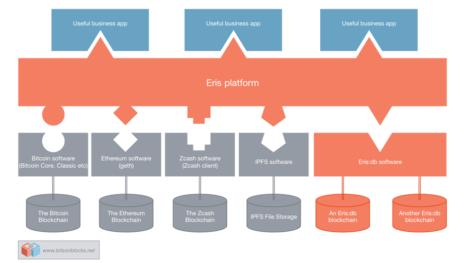 When you run Eris, you can connect it to existing public or private blockchains, including The Bitcoin Blockchain, The Ethereum Blockchain, Zcash, and others. If you want to make your own private or internal blockchain, Eris also has its own blockchain-management component called Eris:db which can create permissionable blockchains at your command.