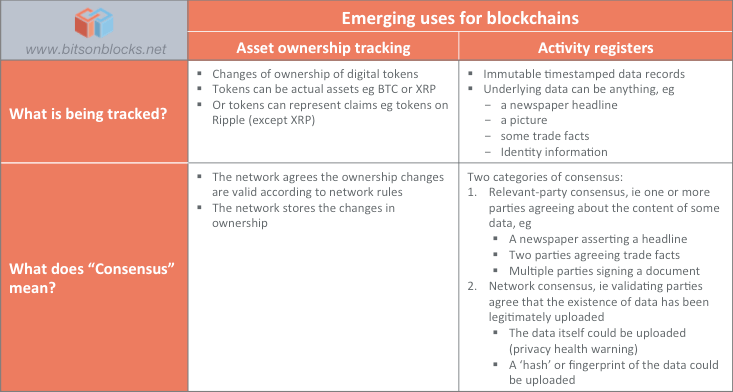 This post tries to describe two very different uses for blockchain technology: Digital Token Ledgers that record ownership changes of digital tokens, and Activity Registers that record timestamped proofs of existence of data or agreements about data. Bitcoin is used for both.